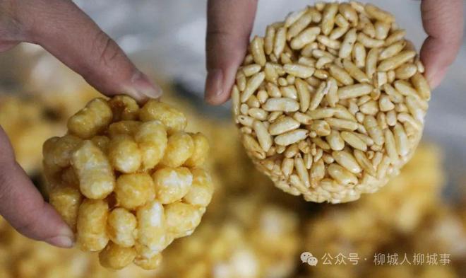 米花糖在柳城也算是一種比較常見的小吃,用大米和玉米兩種食材來做爆米花,再把爆好的米花和糖漿混合,得到一個(gè)圓形的米花球,不同食材,不同口感,但都酥脆香甜,是不少家庭都喜歡備的年貨。