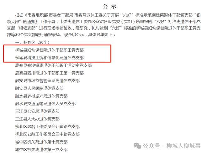 近日,中共柳州市委老干部局、中共柳州市委離退休干部工作委員會(huì)聯(lián)合印發(fā)了《關(guān)于確定2023年柳州市離退休干部黨組織“銀領(lǐng)支部”的通知》,其中,柳城縣婦幼保健院退休干部職工黨支部和柳城縣科技工貿(mào) 和信息化局退休黨支部入選。