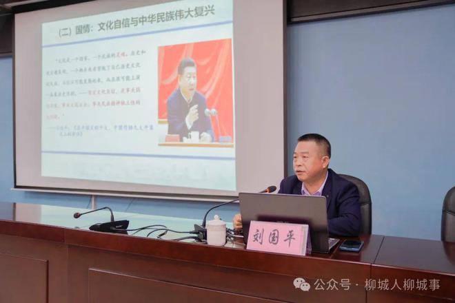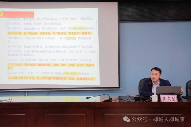 會議邀請了柳州市委黨校黨史黨建教研室主任、副教授劉國平,柳州市發(fā)展和改革委員會經濟體制改革和政策研究科科長伍文能兩位老師到現場宣講。兩位老師均是柳州市學習習近平文化思想和習近平總書記對廣西重大方略要求專題理論宣講團成員,對習近平文化思想和習近平總書記對廣西重大方略要求有一定的研究基礎,能更好地為與會人員闡述其思想內涵。