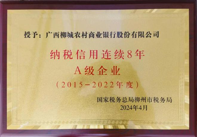 此次被國家稅務總局柳州市稅務局授予的“納稅信用連續(xù)八年A級企業(yè)”榮譽稱號是對柳城農(nóng)商銀行服務地方經(jīng)濟發(fā)展、積極履行社會責任的認可和肯定,更是對該行今后發(fā)展的鼓舞和動力。