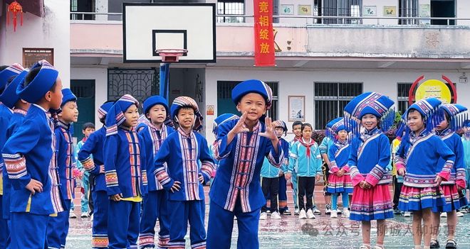 “今天有客人來,我們?cè)陂T口等,學(xué)生站在兩邊,等待客人到來……” 孩子們?cè)诶蠋煹膸ьI(lǐng)下,身著絢麗多彩的壯族民族服飾,開心地圍到一起,唱響壯家迎賓歌,美妙稚嫩、透亮好聽的聲音飄蕩在學(xué)校上空,掀起校園“廣西三月三”民俗系列活動(dòng)的序幕。