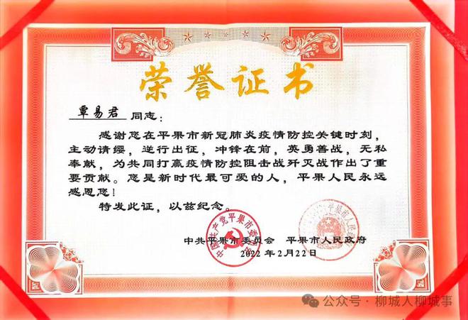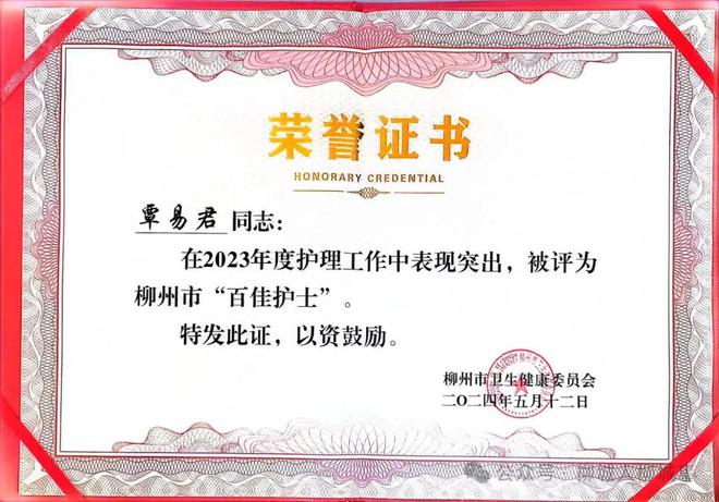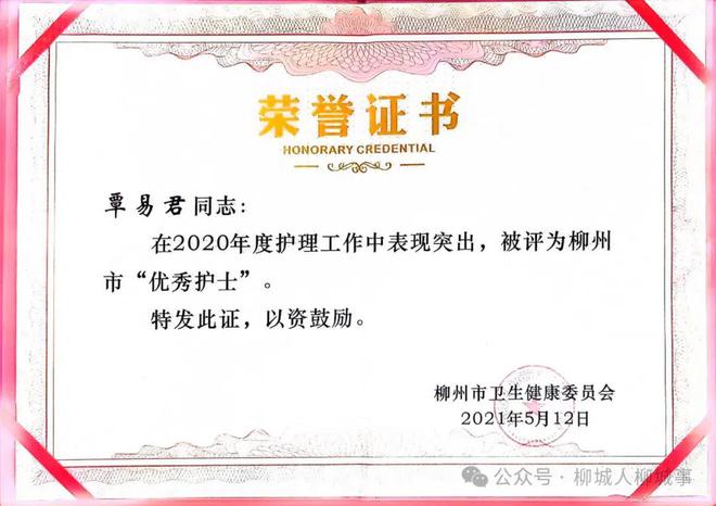 2020年至今,覃易君因表現(xiàn)優(yōu)秀,先后獲得2020年柳州市“優(yōu)秀護(hù)士”、2021年柳城縣“支援抗疫護(hù)士”、2023年度柳州市“百佳護(hù)士”等榮譽(yù)稱號(hào)。