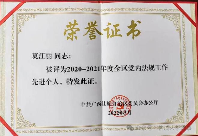 2017、2018、2019連續(xù)三年年度考核優(yōu)秀,榮立三等功,2022年被評為2020—2021年度全區(qū)黨內(nèi)法規(guī)工作先進(jìn)個人,2024年獲柳城縣第十二屆道德模范敬業(yè)奉獻(xiàn)模范榮譽稱號……她就是——莫江麗。 提起莫江麗,就不得不提一提她的工作。