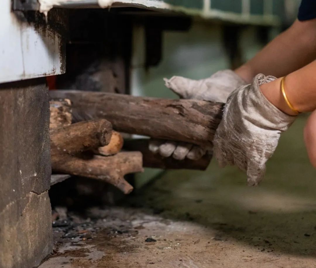 柳城是客家文化的重要發(fā)源地之一,客家人祖祖輩輩擁有沿用傳統(tǒng)鐵鍋制作腐竹的獨特技藝。韋珊與丈夫依托這一祖?zhèn)骷妓嚕诒A粼瓉韨鹘y(tǒng)制作工藝的基礎(chǔ)上,不斷摸索與實驗,將原本的一鍋一灶家庭式生產(chǎn)工藝進行升級迭代。由他們自主改良設(shè)計的超大平底生鐵大鐵鍋,既相連又獨立,只需要一個灶臺加熱就能完成整個工藝流程的生產(chǎn),這不僅保證了腐竹的品質(zhì),也提高了公司的產(chǎn)能和效率。并且,經(jīng)過他們的創(chuàng)新研發(fā),目前腐竹的水分點控制在8個水分點,保存時間提高到了三個月以上,有效打通了產(chǎn)、供、銷的時間屏障。