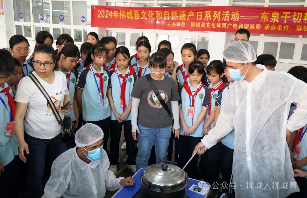 本次活動(dòng)還邀請(qǐng)到了柳城干切粉制作技藝傳承人現(xiàn)場(chǎng)展示干切粉的制作過(guò)程,并向?qū)W生介紹選米、浸泡、蒸煮等制作環(huán)節(jié),鼓勵(lì)孩子們動(dòng)手參與。