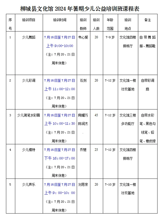 上課時間詳見《柳城縣文化館2024年暑期少兒公益培訓(xùn)班課程表》