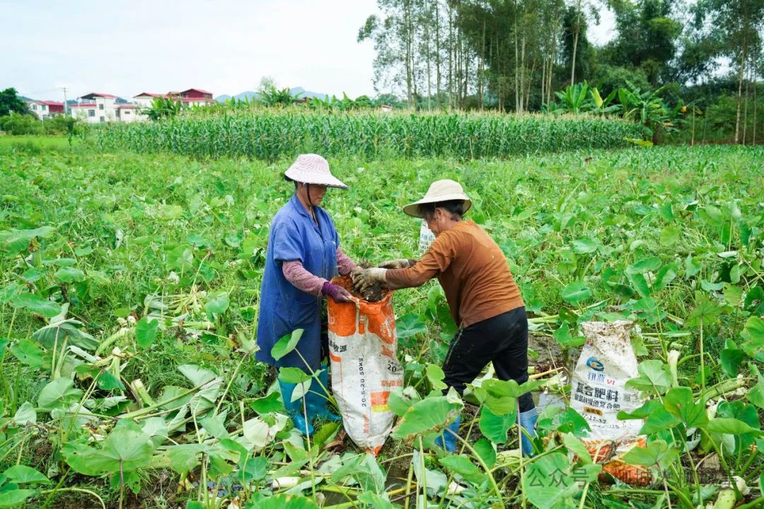 近日,東泉鎮(zhèn)碑塘村和村屯村民陳鳳軍就忙開了。這一天,有老板要來村里收購他家的香芋,他請了十幾位村民來幫忙,以盡快把地里的香芋采挖出來。他說,今年由于雨水較多,香芋的產(chǎn)量相較去年有所減少,畝產(chǎn)大約3500斤左右。目前收購價是2.2元每斤,基本達到他的期望。