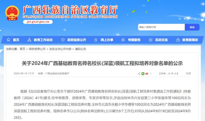 近日,自治區(qū)教育廳發(fā)布《關(guān)于2024年廣西基礎(chǔ)教育名師名校長(深藍)領(lǐng)航工程擬培養(yǎng)對象名單的公示》