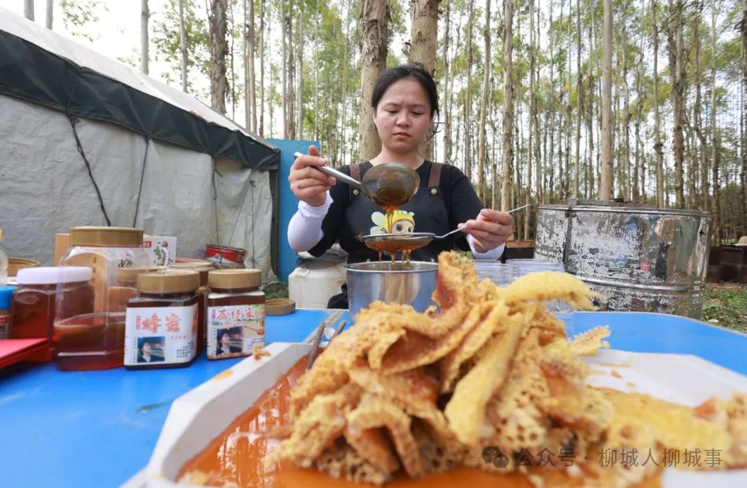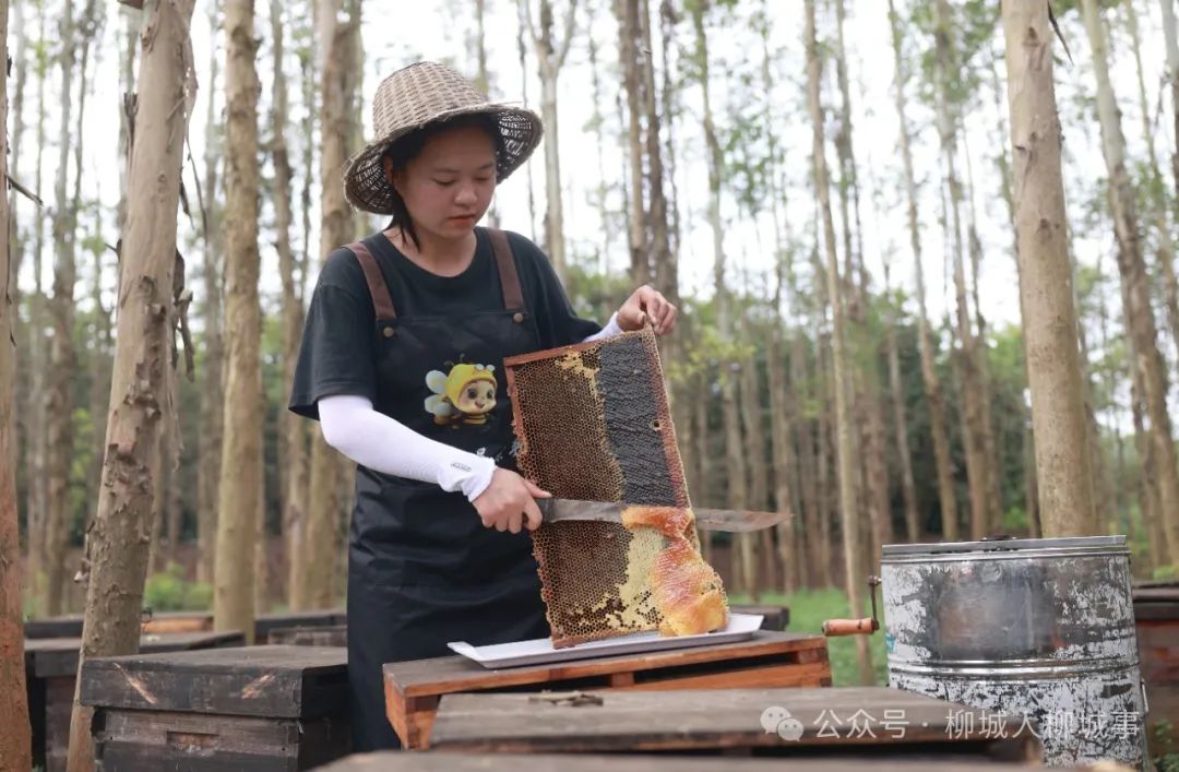 近日,小編來到柳城縣東泉鎮(zhèn)中段村上中段屯,看到桉樹林下擺放著100多個方方正正的蜂箱,成群結(jié)隊的蜜蜂圍著蜂箱飛舞。身著防蜂服的吳素英打開蜂箱蓋子,取出結(jié)滿了蜂巢蜜的蜂脾,用刀割去蜂蠟后放入搖蜜機。一頓操作后,吳素英向大家展示她的“甜蜜”成果。