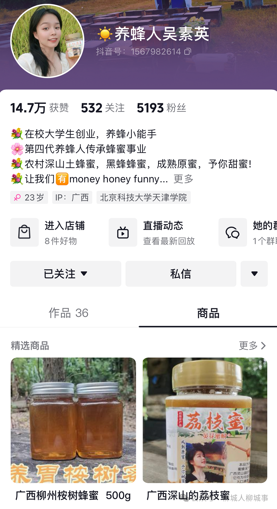 大學(xué)閑暇之余,吳素英在網(wǎng)絡(luò)開辟自己的“甜蜜賽道”。吳素英在個人新媒體賬號上直播銷售自家蜂蜜,并上傳自己在家鄉(xiāng)拍攝的養(yǎng)蜂視頻教授養(yǎng)殖技巧,得到網(wǎng)友的大量關(guān)注和點贊,短短2個月內(nèi)漲粉5000多人。