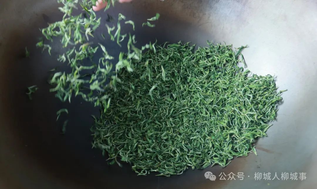 傳統(tǒng)手工炒茶,殺青是最為關(guān)鍵的環(huán)節(jié),時(shí)間、溫度、手法都影響著茶葉的品質(zhì),炒制人需要根據(jù)茶葉的水分,及時(shí)調(diào)整炒鍋的溫度和手法?!爱?dāng)時(shí)鍋里面的溫度有200多度,手都被燙起泡了?!眲⒃戮暾f(shuō),被燙起泡是每個(gè)制茶人學(xué)習(xí)炒茶的“標(biāo)配”。
