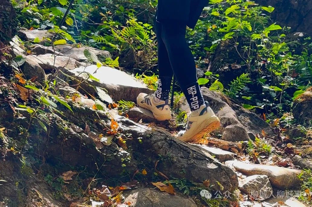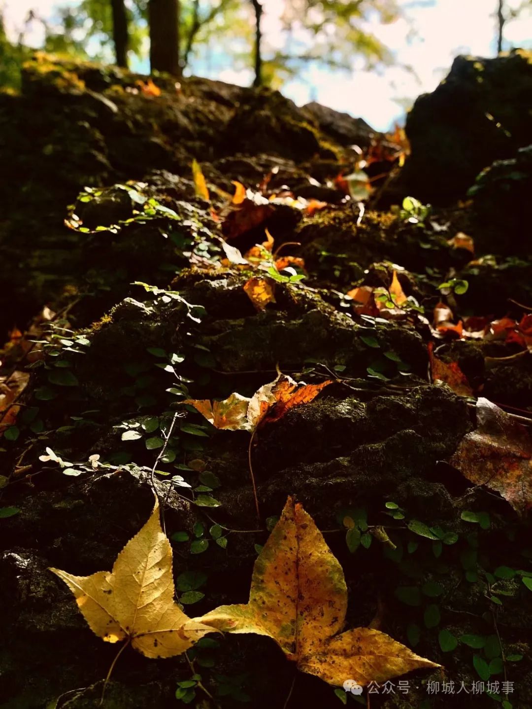 入目之處,漫山遍野綠植環(huán)繞,層層疊疊,郁郁蔥蔥。亮亮的太陽(yáng)光透過(guò)樹(shù)葉,打在山石、野草上,打在锃亮的石板路上和厚厚的落葉上,光影斑駁,天與地鑲上金邊,黃與綠相映成趣,美如一幅油畫(huà)。