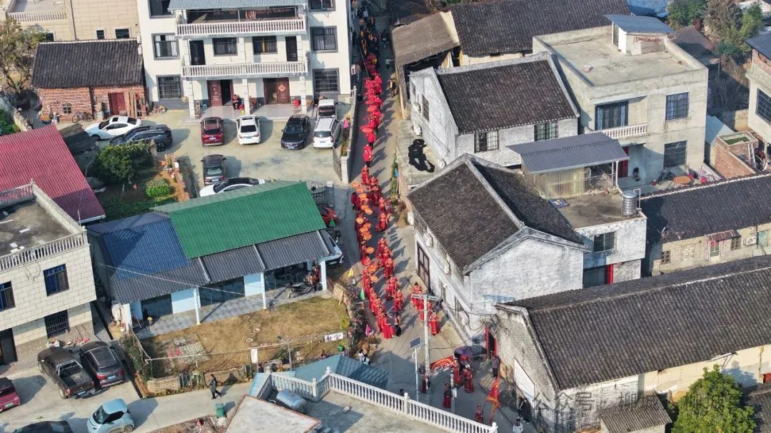 當(dāng)天上午,外嫁“金花”們身著大紅禮服,撐著花傘,挑著花籃,在舞獅隊的帶領(lǐng)下,從東泉鎮(zhèn)新時代文明實踐廣場走回村中。村中的鄉(xiāng)親們,搭起拱門,放起鞭炮,迎接他們的“女兒”回家。