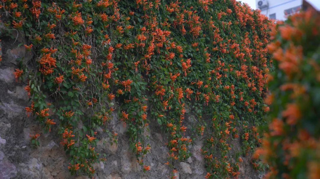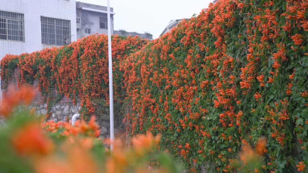 在柳城縣城鼎豐路,一幅絕美的春日畫(huà)卷就此展開(kāi)。道路旁圍墻上,炮仗花熱烈地盛開(kāi)著,橘黃色的花朵如點(diǎn)點(diǎn)繁星,又似串串鞭炮,整面圍墻仿佛披上了一層靚麗的織錦。