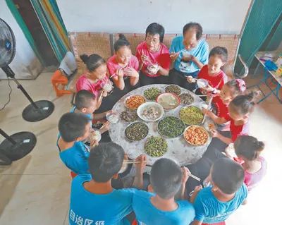 彩調(diào)班中午下課后,周錫生和何秋萍與不回家的孩子一起吃飯。湯曉逵攝(人民視覺)