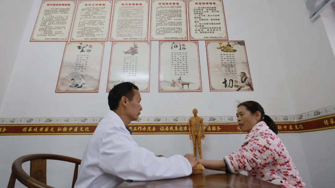 走進(jìn)柳城縣六塘鎮(zhèn)拉燕村中醫(yī)閣,各類中醫(yī)宣傳標(biāo)識隨處可見。在中醫(yī)診室,村醫(yī)韋洪選運(yùn)用傳統(tǒng)中醫(yī)的望、聞、問、切,為患者診斷病情,開出個性化的中藥診方。