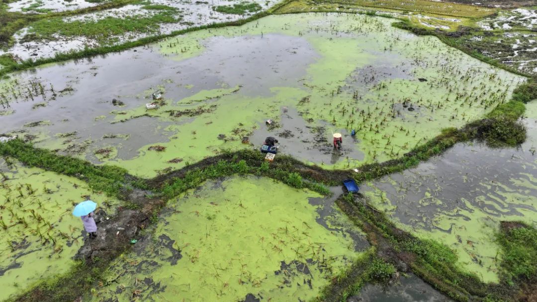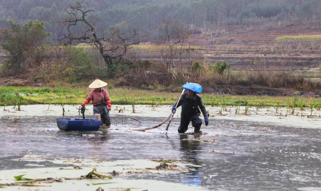 2月21日,小編來到柳城縣鳳山鎮(zhèn)二塘村,盡管天空下著雨,農(nóng)戶伍忠利和妻子仍然頭戴防水帽,身著防水褲,小心翼翼地踏入泥濘的水田中采收茨菇。