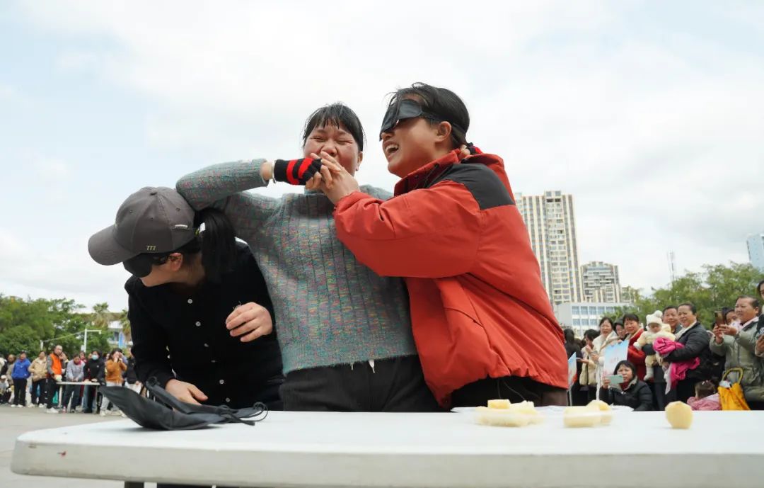 最讓觀眾拍掌叫好的比賽當(dāng)屬“蔗么甜”項目。比賽中,隊員們?nèi)艘唤M,兩名蒙著眼的隊員抬著另外一人,朝著擺放甘蔗的終點前進(jìn)。到達(dá)后,蒙眼的隊員要準(zhǔn)確地找到甘蔗并喂給同伴?,F(xiàn)場“意外”頻出,有跑錯道的,有喂不著甘蔗的......精彩的活動博得了觀眾的陣陣歡呼和掌聲。
