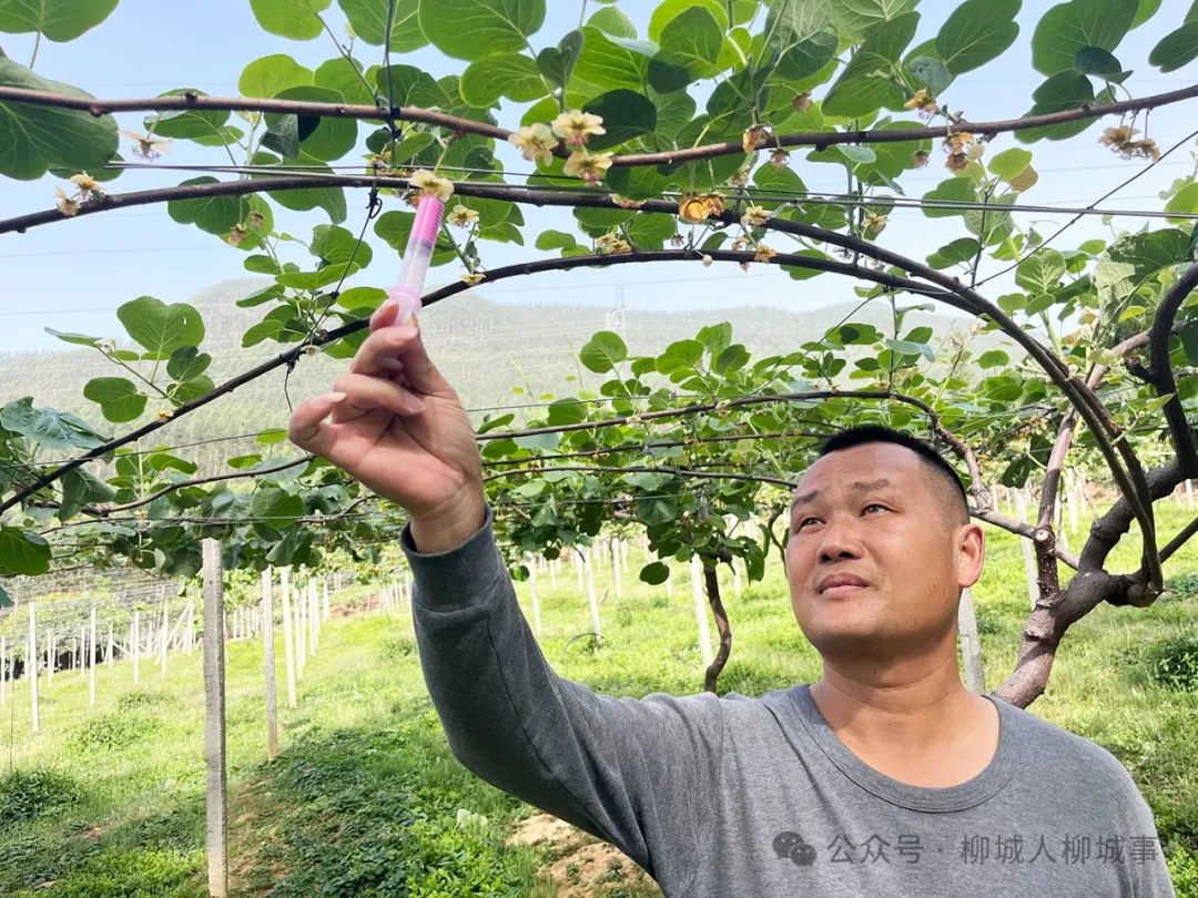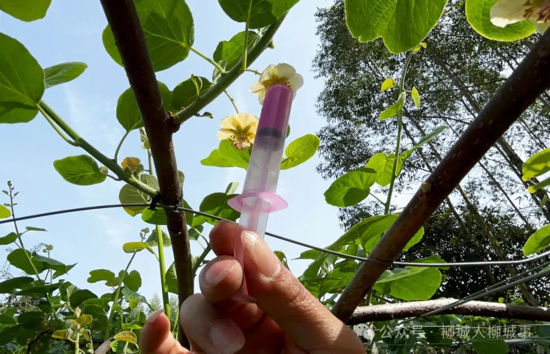 “獼猴桃由于花朵缺乏蜜腺,泌蜜量較少,對蜜蜂的吸引力相對較低,自然授粉的話,坐果率不高,對獼猴桃的產(chǎn)量和果品都會產(chǎn)生很大的影響?!眲⒘⒌陆榻B說,每年春季,夫婦倆都要對自家種植的9畝獼猴桃進行人工授粉,力求在最佳授粉期內(nèi)圓滿完成作業(yè),為獼猴桃的豐收筑牢根基。劉立德夫婦的授粉工具是用注射器改制成的。把注射針管頭前端部分去掉,將雄花粉裝滿針筒,將針筒口對著花朵輕輕一頂,把雄花粉涂抹在雌蕊的柱頭上,一朵花的授粉過程就完成了。