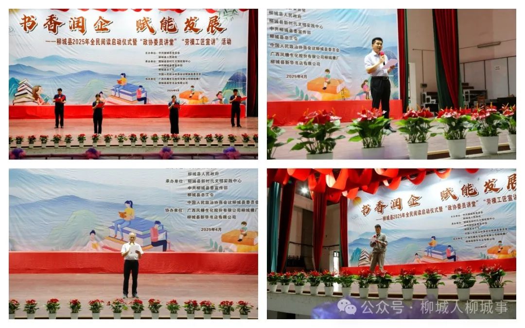 啟動儀式現(xiàn)場,柳城縣新華書店帶來朗誦節(jié)目《書中的四季》,以優(yōu)美的聲音帶領(lǐng)大家領(lǐng)略書中的美好世界;縣政協(xié)委員、廣西鳳糖生化股份有限公司副總裁廖耀文分享閱讀感悟,傳遞知識的力量;現(xiàn)場播放視頻展示勞模工匠精神風采,讓大家深刻感受到勞動者的崇高精神;自治區(qū)級勞模代表嚴俊繼、柳城工匠代表賴佳君進行宣講,他們通過分享閱讀的故事、成長經(jīng)歷以及如何在書籍中獲取靈感,用來解決在車間中遇到的問題,通過閱讀為企業(yè)發(fā)展賦能,激勵著在場的每一個人;個人獨唱《老家的味道》為活動增添了溫馨的氛圍。