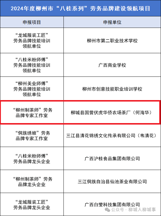 柳城縣國(guó)營(yíng)伏虎華僑農(nóng)場(chǎng)茶廠(何海華)、三江縣清花錦繡文化傳承有限公司(韋清花)2家單位被認(rèn)定為2024年度“八桂系列”勞務(wù)品牌專(zhuān)家工作室;
