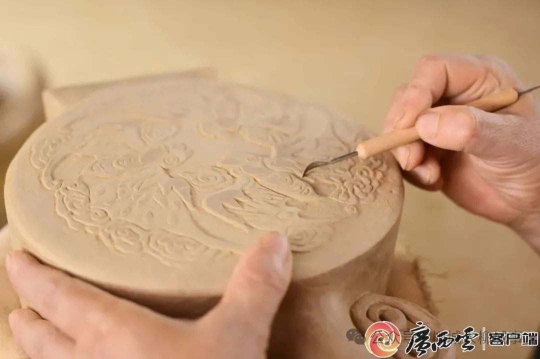 幾十年來,他廣開師門,所帶徒弟近百,其中鄧任飛、周錦新、蔣田田、韋阿四、陽金芳等已在業(yè)界小有名氣。更讓他欣慰的是,通過推動“陶藝進(jìn)校園”,從小學(xué)、中學(xué)到大學(xué),孩子們得以在課堂里觸摸泥土的溫度。他的兒子和女兒,也緊隨父親的腳步,在江西省景德鎮(zhèn)站穩(wěn)腳跟,成為新一代的傳承火種。徒弟覃晴在傳統(tǒng)技藝的基礎(chǔ)上大膽融入現(xiàn)代元素,深入挖掘當(dāng)?shù)氐奈幕厣?,將桑葉、鳳山地方美景等融入陶瓷作品創(chuàng)作中,開發(fā)出獨具地方特色的陶瓷文創(chuàng)作品。