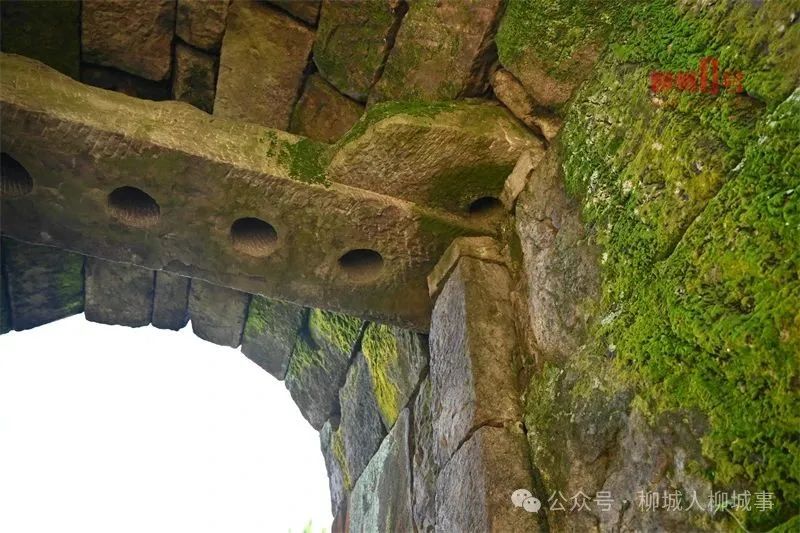 “過了潭水,再往前下坡就到西門了?!绷喂鹨呎f邊在前方帶路。果然,經(jīng)過一處陡峭的石路,一段數(shù)十米長的城墻就映現(xiàn)在記者眼前。只見城墻最低處為一個由長條石砌起的拱門,門洞寬約1.5米,門長、高約3米。在門洞內(nèi)安裝有一塊門檻石,上有5個圓形的插銷孔。在門檻石上方的條石上,則是5個方形的孔。旁邊還有門栓孔。