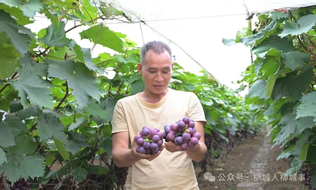 在東泉鎮(zhèn)螺田村甲伴屯,村民韋建勇正穿梭在郁郁蔥蔥的葡萄藤下,小心地采摘著一串串紫黑發(fā)亮的夏黑葡萄??諝庵袕浡咸训南闾饸庀ⅲ@是屬于他的豐收季節(jié)。