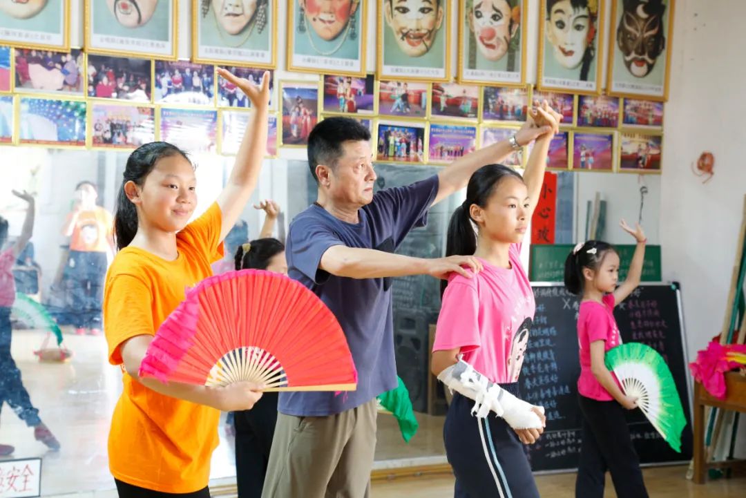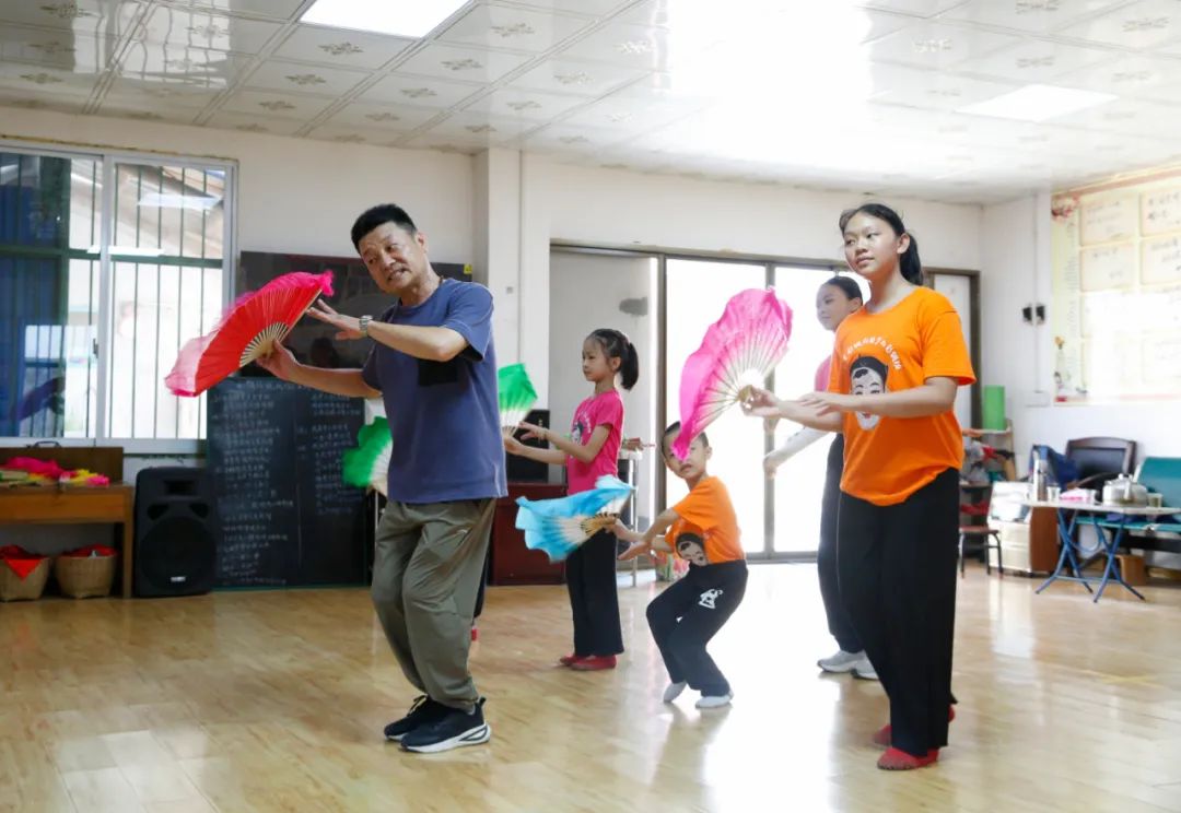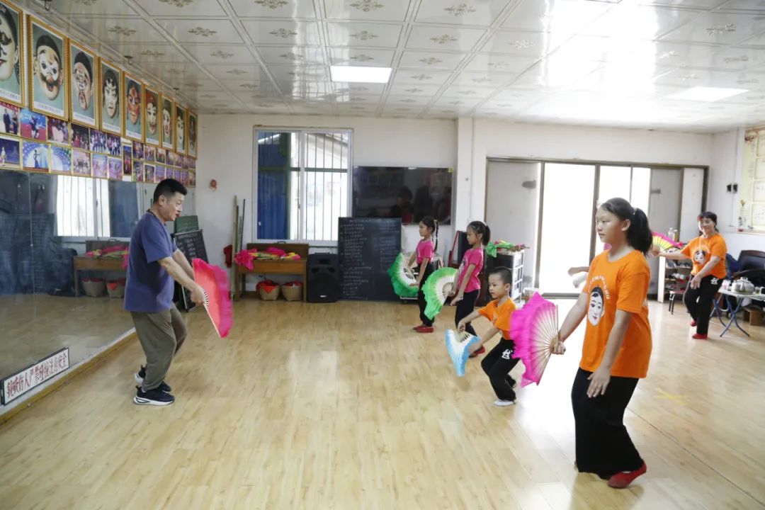 蔣劍在指導過程中表示,學好彩調,扎實的“四功”“五發(fā)”基本功必不可少,演員需通過“手、眼、身、發(fā)、步”等肢體動作,完成“唱、念、做、舞”等表演形式。蔣劍針對每位小演員的特點,對他們進行了一對一的針對性輔導,從扇花、十字步等動作,再到唱腔,蔣劍一招一式地教,小演員們一板一眼地學,爭取能在原有基礎上有所提升。