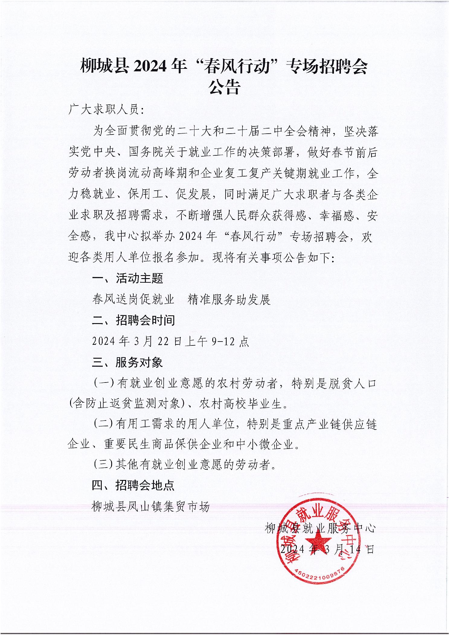 柳城縣2024年“春風(fēng)行動”專場招聘會公告(鳳山鎮(zhèn))