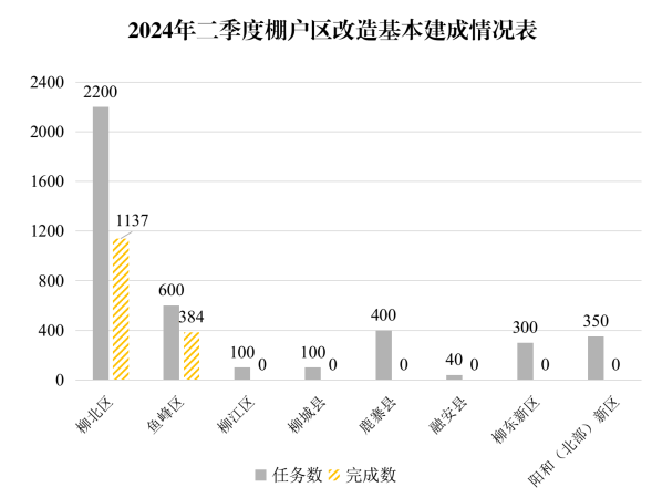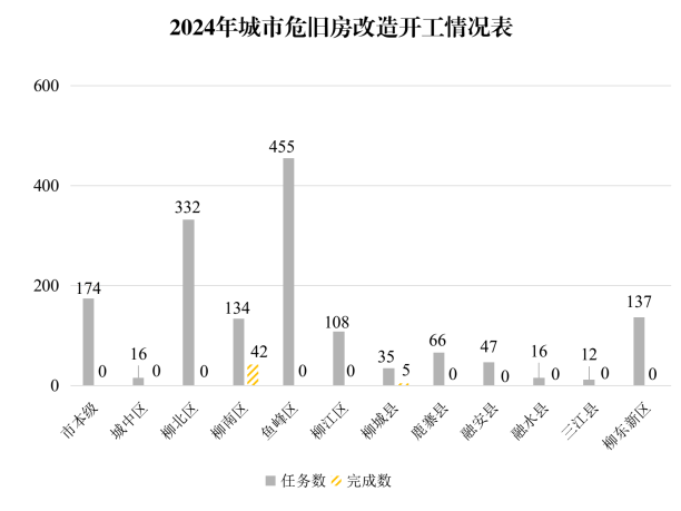 2024年,自治區(qū)下達(dá)柳州市棚戶區(qū)(城市危舊房)改造開工任務(wù)為1532套。截至2024年6月30日,已開工47套,完成年度目標(biāo)任務(wù)的3.07%。