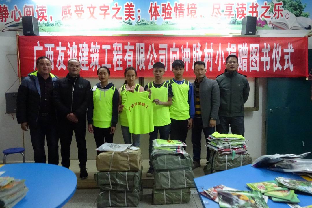 ? ? 11月21日,?廣西友鴻建筑工程有限公司部分愛心代表到沖脈中心小學舉行捐贈活動,捐贈圖書668冊,同時贊助該校運動隊教練、隊員服裝26套,價值總計12000余元。這是廣西友鴻建筑工程有限公司作為愛心企業(yè)用實際行動關心、支持教育事業(yè)發(fā)展的又一重要舉措,為我縣推進義務教育均衡發(fā)展貢獻出一份愛心和力量!