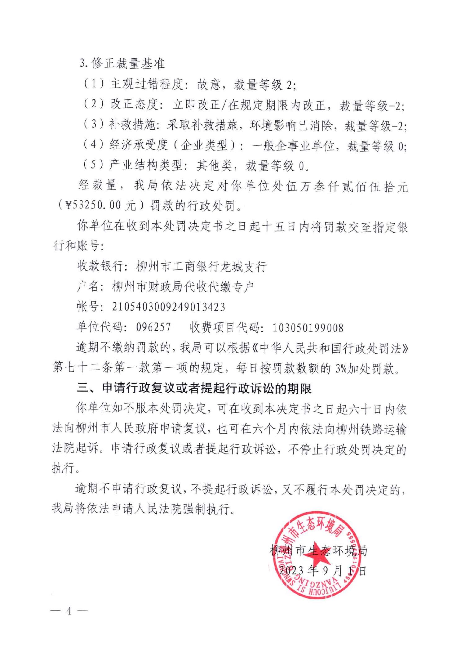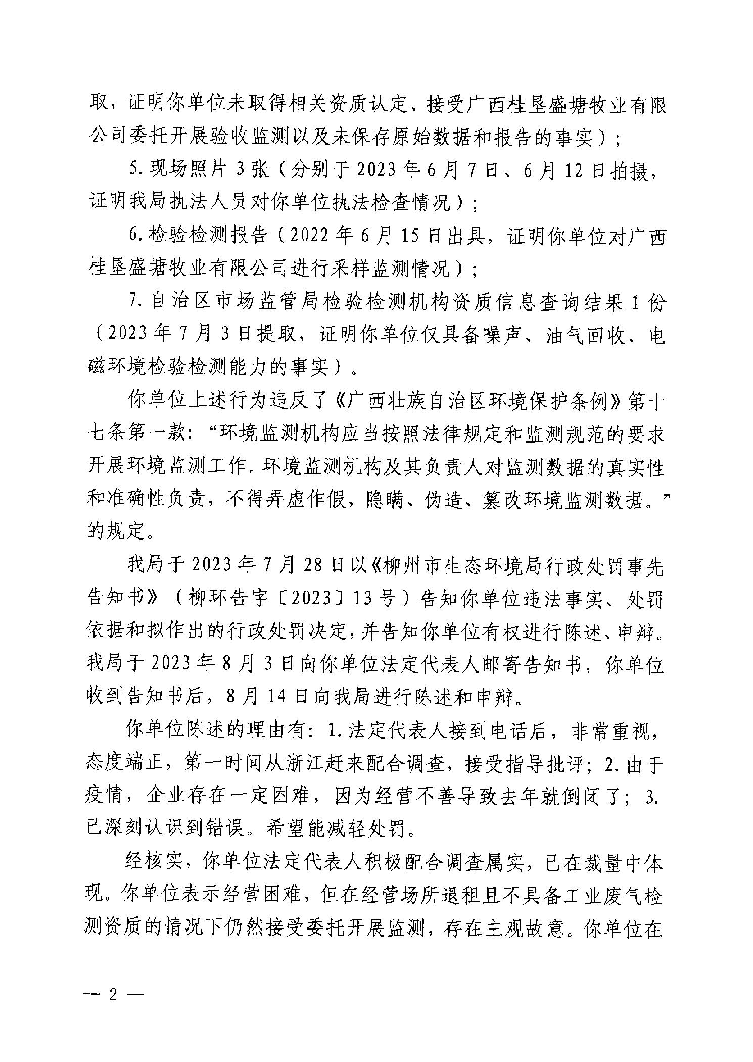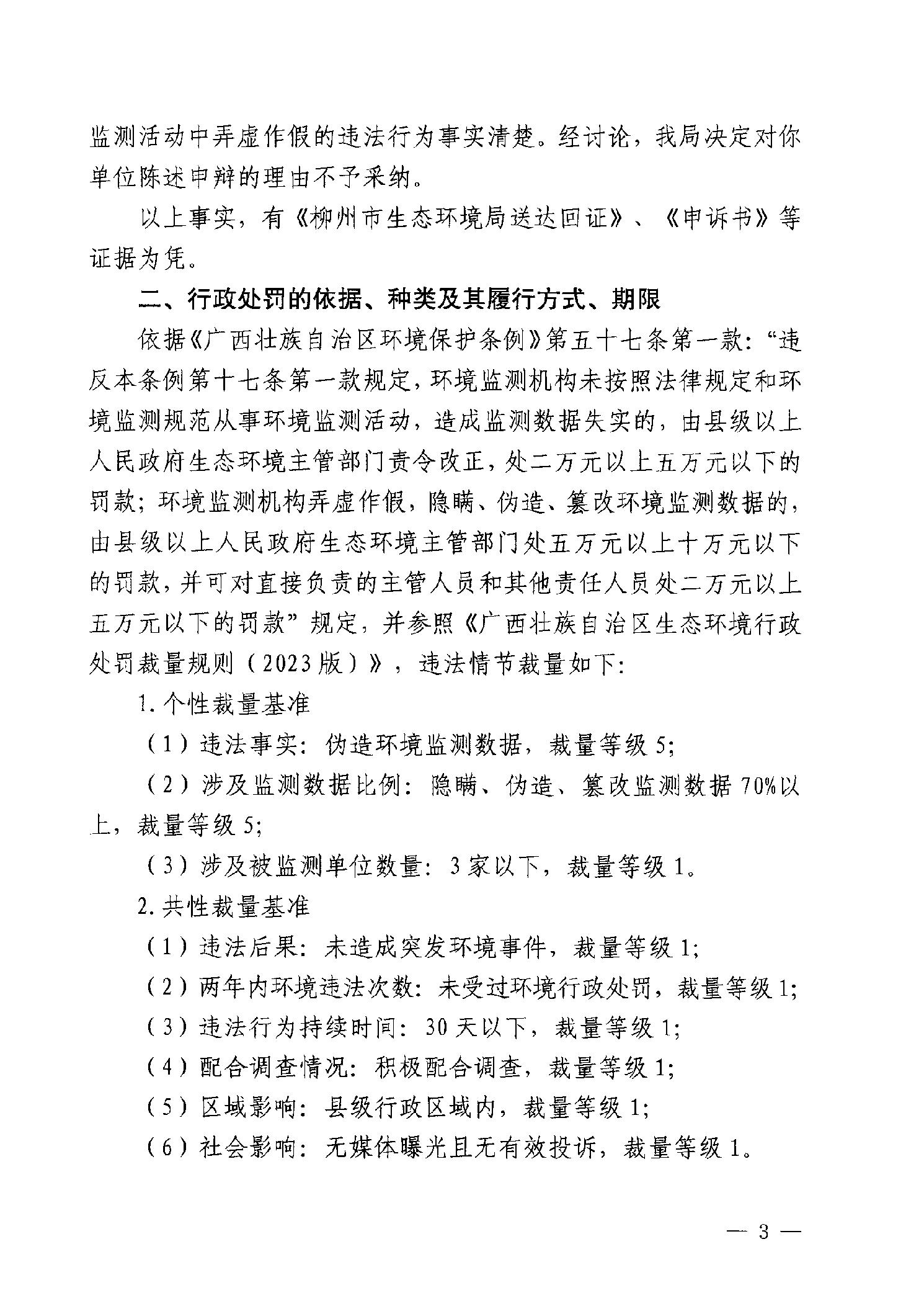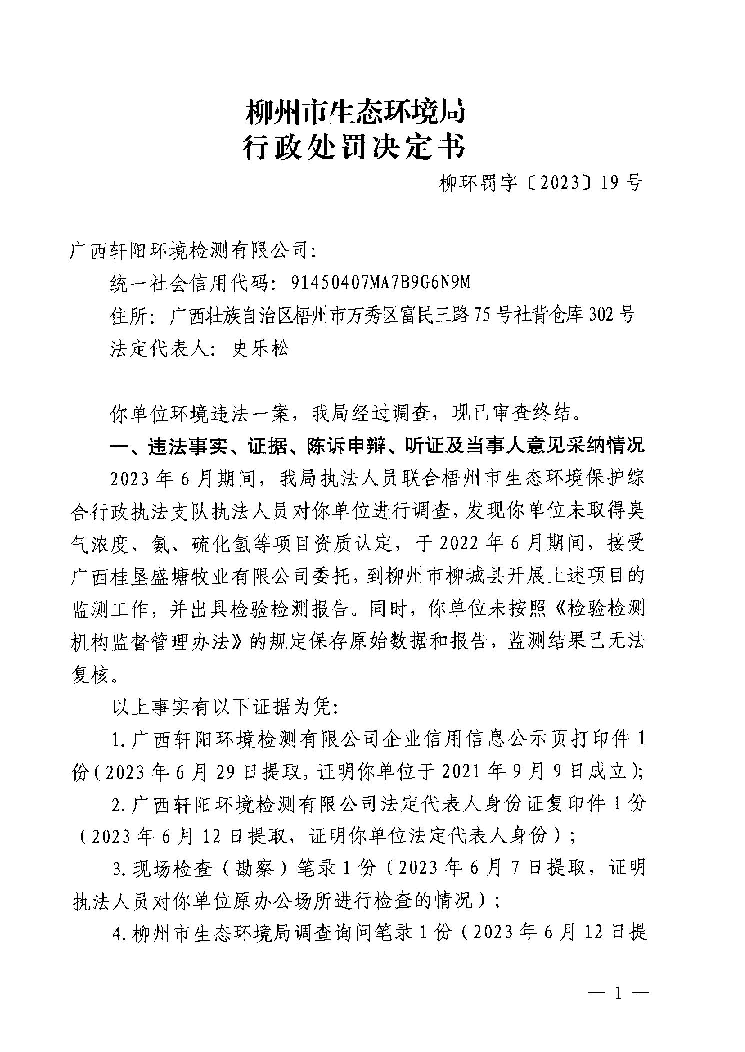 柳州市生態(tài)環(huán)境局行政處罰決定書 柳環(huán)罰字〔2023〕19號--廣西軒陽環(huán)境檢測有限公司