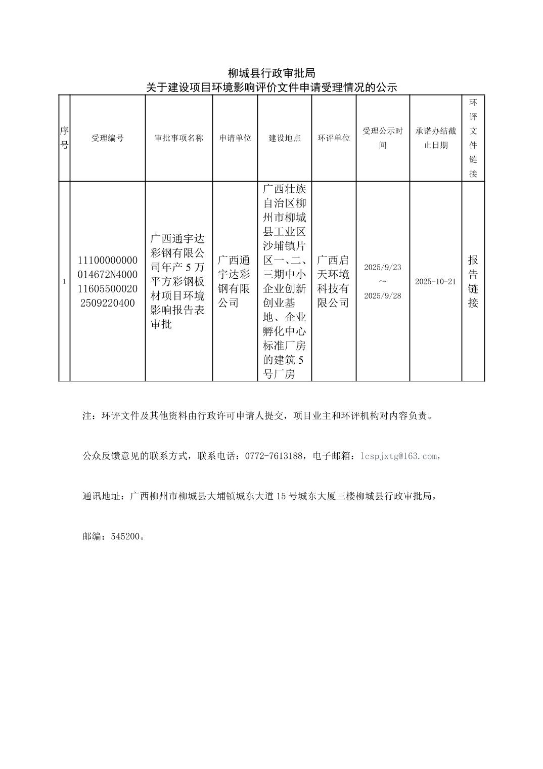 2025年9月23日柳城縣行政審批局關于建設項目環(huán)境影響評價文件申請受理情況的公示