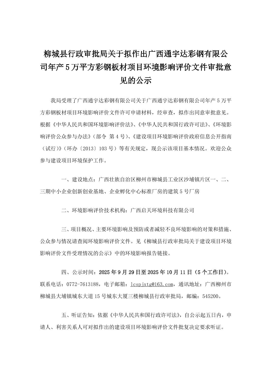 柳城縣行政審批局關(guān)于擬作出廣西通宇達(dá)彩鋼有限公司年產(chǎn)5萬平方彩鋼板材項目環(huán)境影響評價文件審批意見的公示