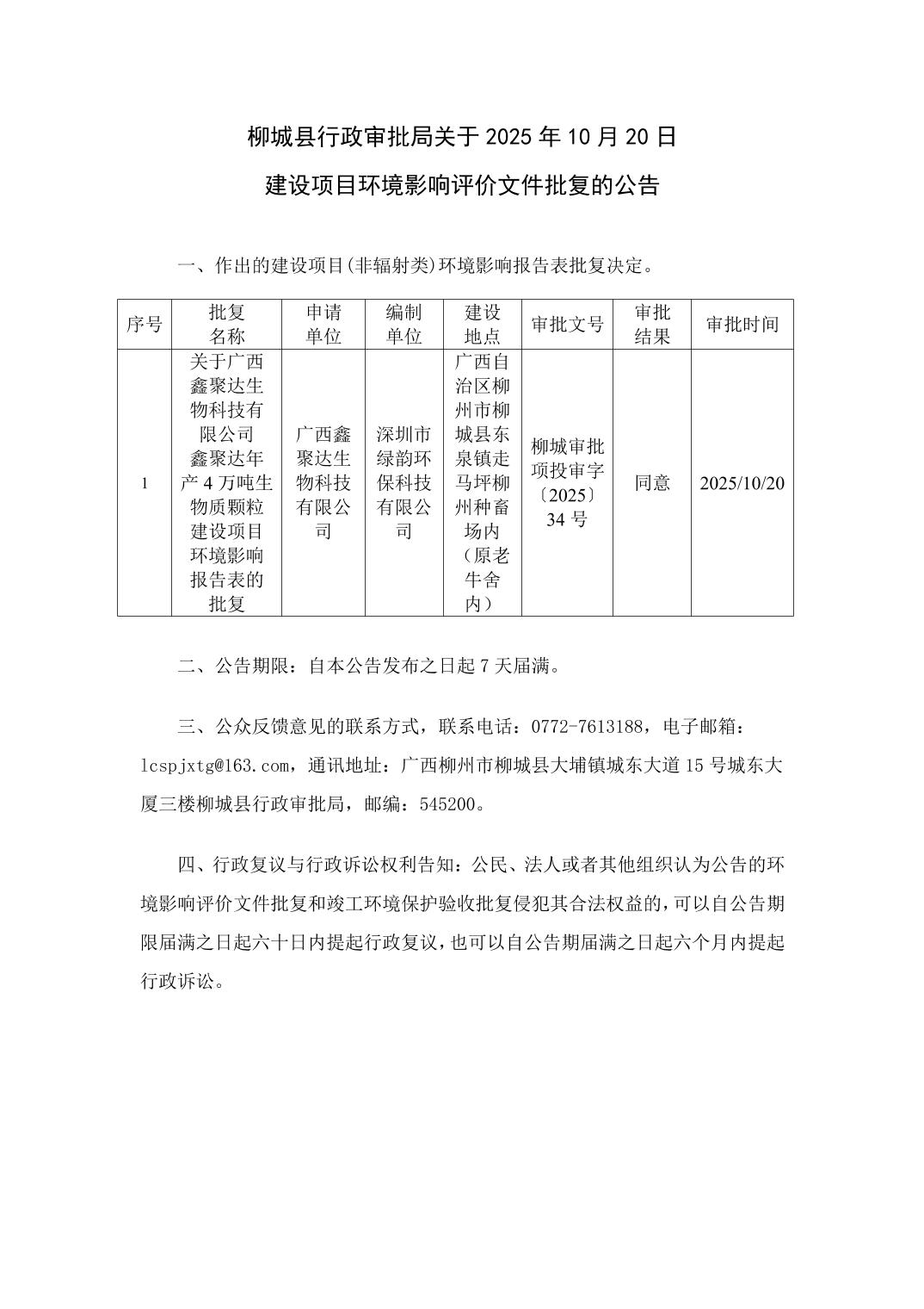 柳城縣行政審批局關(guān)于2025年10月20日建設(shè)項(xiàng)目環(huán)境影響評(píng)價(jià)文件批復(fù)的公告