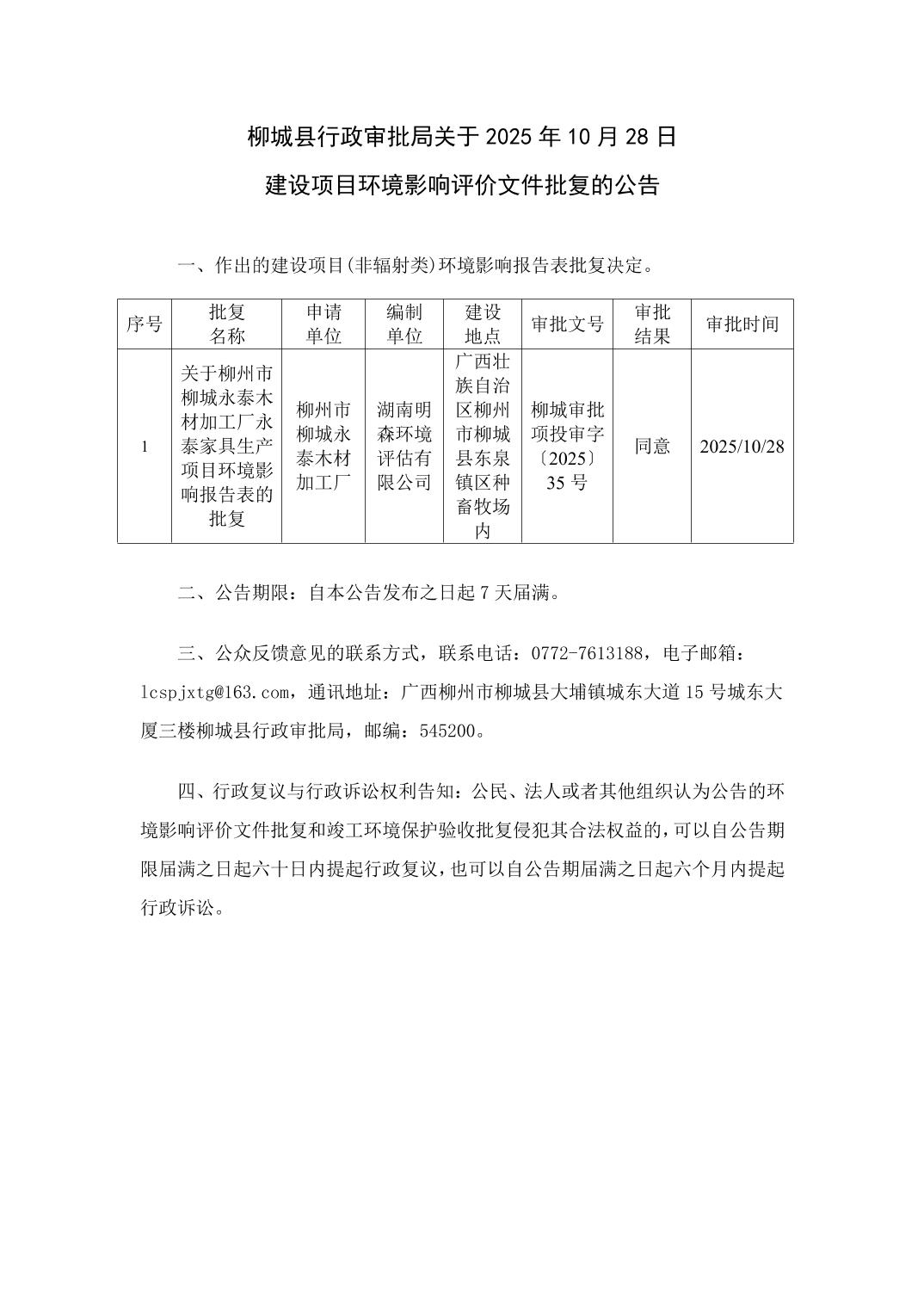 柳城縣行政審批局關(guān)于2025年10月28日建設(shè)項目環(huán)境影響評價文件批復(fù)的公告