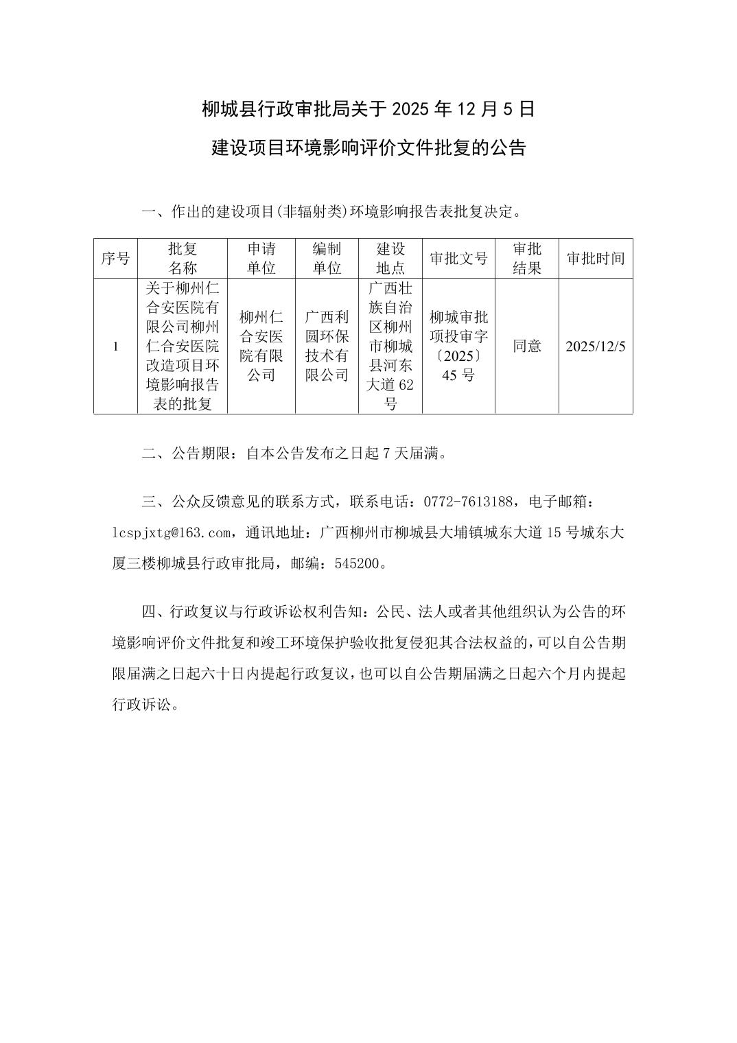 柳城縣行政審批局關(guān)于2025年12月5日建設(shè)項(xiàng)目環(huán)境影響評價(jià)文件批復(fù)的公告