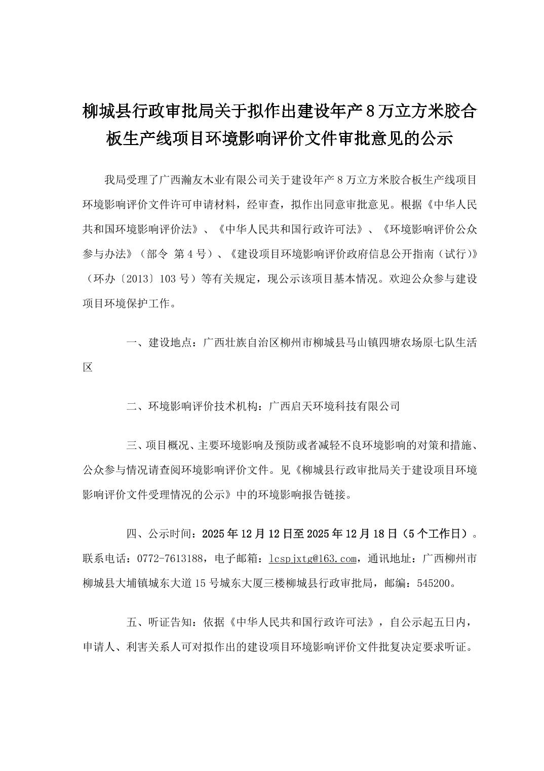 柳城縣行政審批局關(guān)于擬作出建設(shè)年產(chǎn)8萬(wàn)立方米膠合板生產(chǎn)線(xiàn)項(xiàng)目環(huán)境影響評(píng)價(jià)文件審批意見(jiàn)的公示