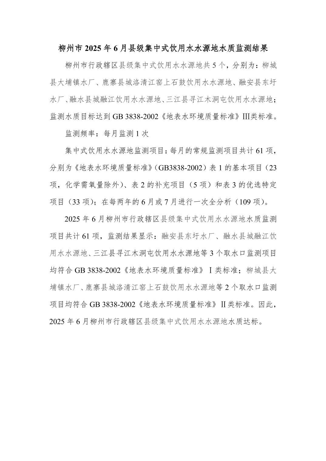 2025年6月份柳州市縣級(jí)飲用水質(zhì)量報(bào)告