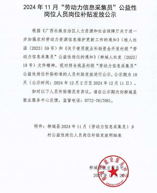 2024 年 11 月“勞動(dòng)力信息采集員”公益性崗位人員崗位補(bǔ)貼發(fā)放公示