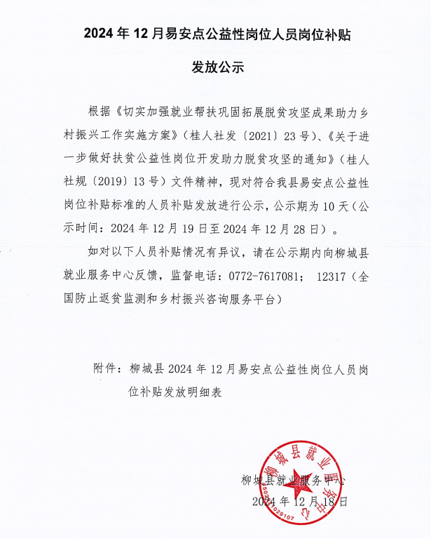 2024 年 12月易安點(diǎn)公益性崗位人員崗位補(bǔ)貼發(fā)放公示