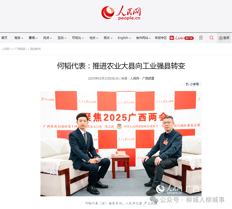 人民網(wǎng)南寧1月15日電 (付華周)1月14日,廣西人大代表、柳城縣縣長(zhǎng)何韜接受人民日?qǐng)?bào)客戶端、人民網(wǎng)專訪。何韜代表表示,今年的政府工作報(bào)告對(duì)縣域經(jīng)濟(jì)發(fā)展作出專門部署,柳城作為柳州工業(yè)高質(zhì)量發(fā)展的主要拓展區(qū),工業(yè)有基礎(chǔ),農(nóng)業(yè)有特色,“自治區(qū)提出的這一鮮明導(dǎo)向進(jìn)一步明確了我們今年工作的關(guān)鍵點(diǎn)、發(fā)力點(diǎn)和突破點(diǎn),這為我們推進(jìn)農(nóng)業(yè)大縣向工業(yè)強(qiáng)縣轉(zhuǎn)變發(fā)展提供了方法路徑,也更加堅(jiān)定了我們做好工作的信心和決心。”